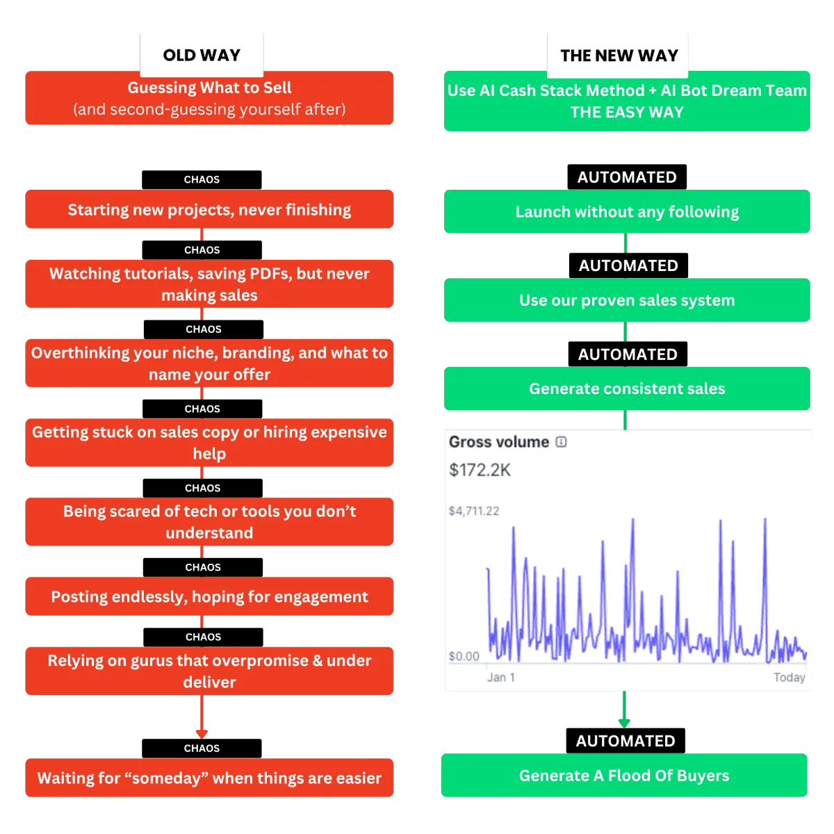 You’ll get instant access to the AI Cash Stack Method™, plus an easy to follow step-by-step guided checklist with ZERO fluff to design,create, sell, and scale your first (or next) digital product, using the custom-trained AI Bot Dream Team™ (Value: $497+)